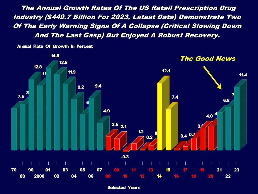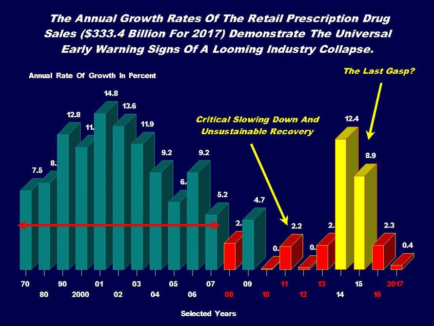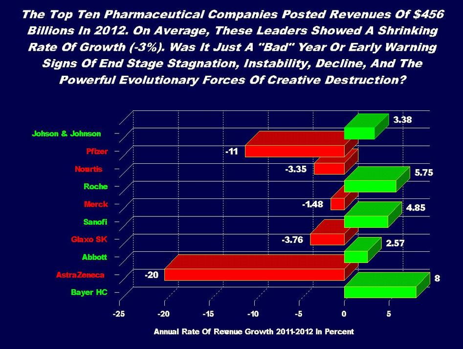 Big Pharma was in big trouble. Starting in 2013, this powerful industry demonstrated an explosive effort to reverse the stagnating growth rates and contracting revenues. However, this effort did not last; there was a stunning crash from 2014 and 2017. It was a whopping 97% crash. Big Pharma incontrovertibly demonstrated the two universal early warning signs of a sudden and violent collapse. The good is that the collective leadership managed to make the "breakout" into a robust new life cycle.