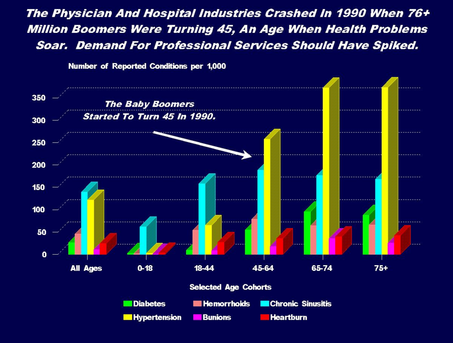 The healthcare industry crashes started in 1990 when the then-largest cohort, the Baby Boomers (about 76+ million persons), was turning 45 years old. The demand for services should have surged. Luckly, this phenomenon buffered the crashes which would have been more severe..
