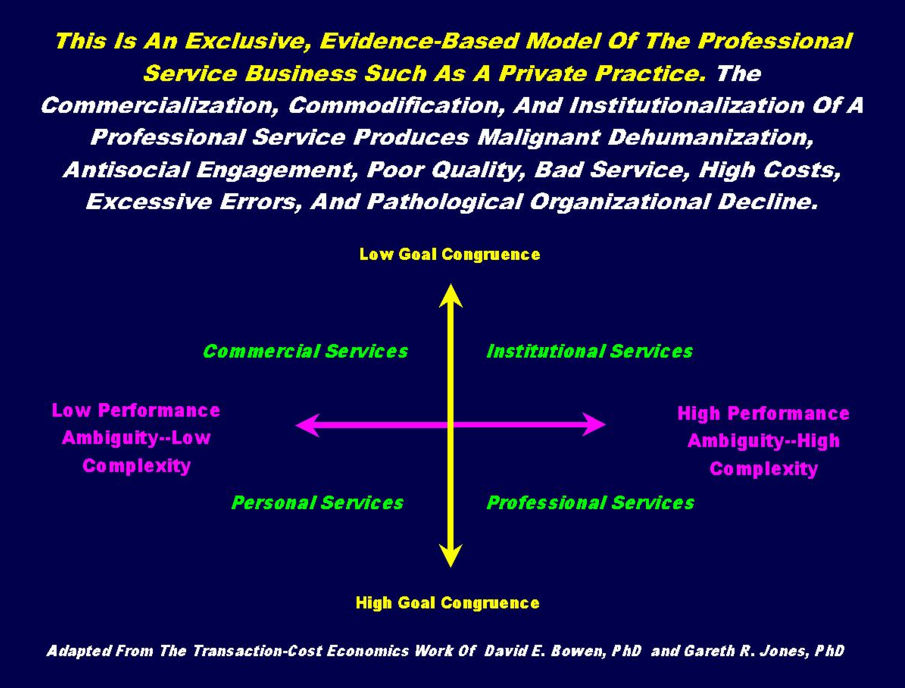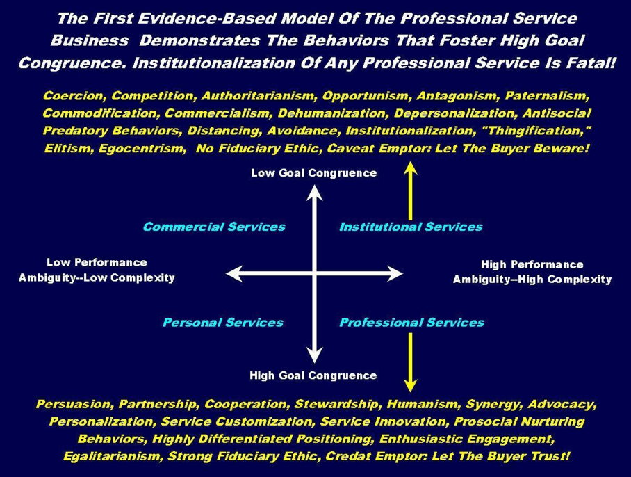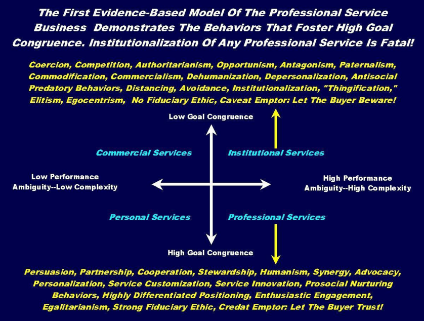 The subtle and progressive institutionalization of a professional service business such as a medical or dental practice or a hospital fosters low goal congruence which produces pathological, contra-indicated behaviors. Proactively managing and maximizing goal congruence will produce highly favorable behaviors among all stakeholders. Here are two hypothetical, dynamic models.