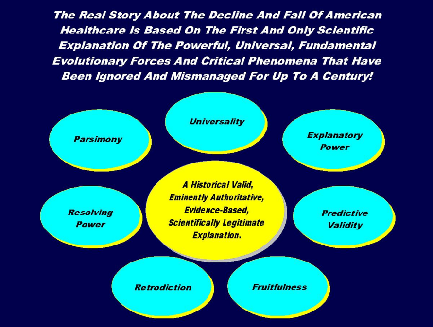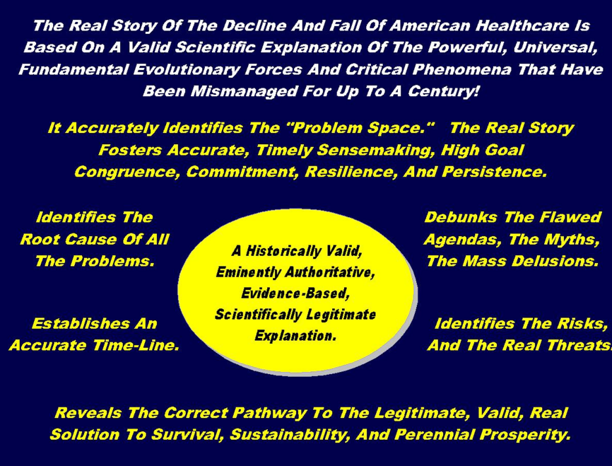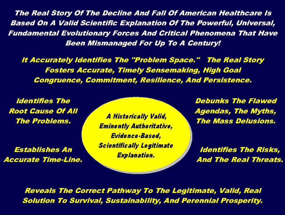 the definitive authority on the evolution, and devolution, of the major components of the provider sector of American healthcare. It's the real story because it is the first and only formal scientific explanation based on a century-old mathematical law. Hence, the explanation provides both high explanatory power and high "predictive validity" reaching 100% accuracy. Plus, it's the real story because it produced a valid timeline. What's more, it is the real story because the data supporting the claims comes from the gold-standard US government study, the National Health Expenditures Survey, that has meticulously tracked the healthcare industry for the past six decades. Creating a scientific explanation allows all claims to be objectively challenged and proposed solutions to be evaluated prudently.