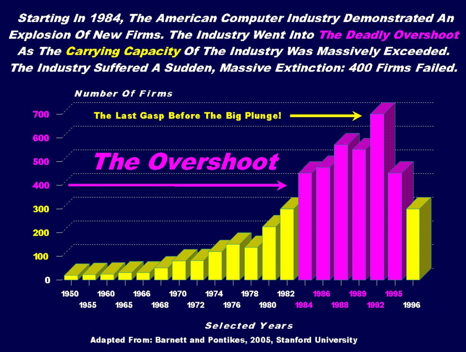 One of the defining outcomes of an industry collapse is high rates of organizational decline and failure. Here when the computer industry crashed, the number of firms went from about 700 down to about 300 in about five years. The firms that survived managed to master the five principles of survival and engagement. The 30+ year R&D program has developed an exclusive management armamentarium based on the five principles and the seven stages of engagement that empowers organization to manage the last gasp, to make the breakout, to make the "paradigm shift," to achieve sufficient "escape velocity," and to enjoy stability and prosperity.