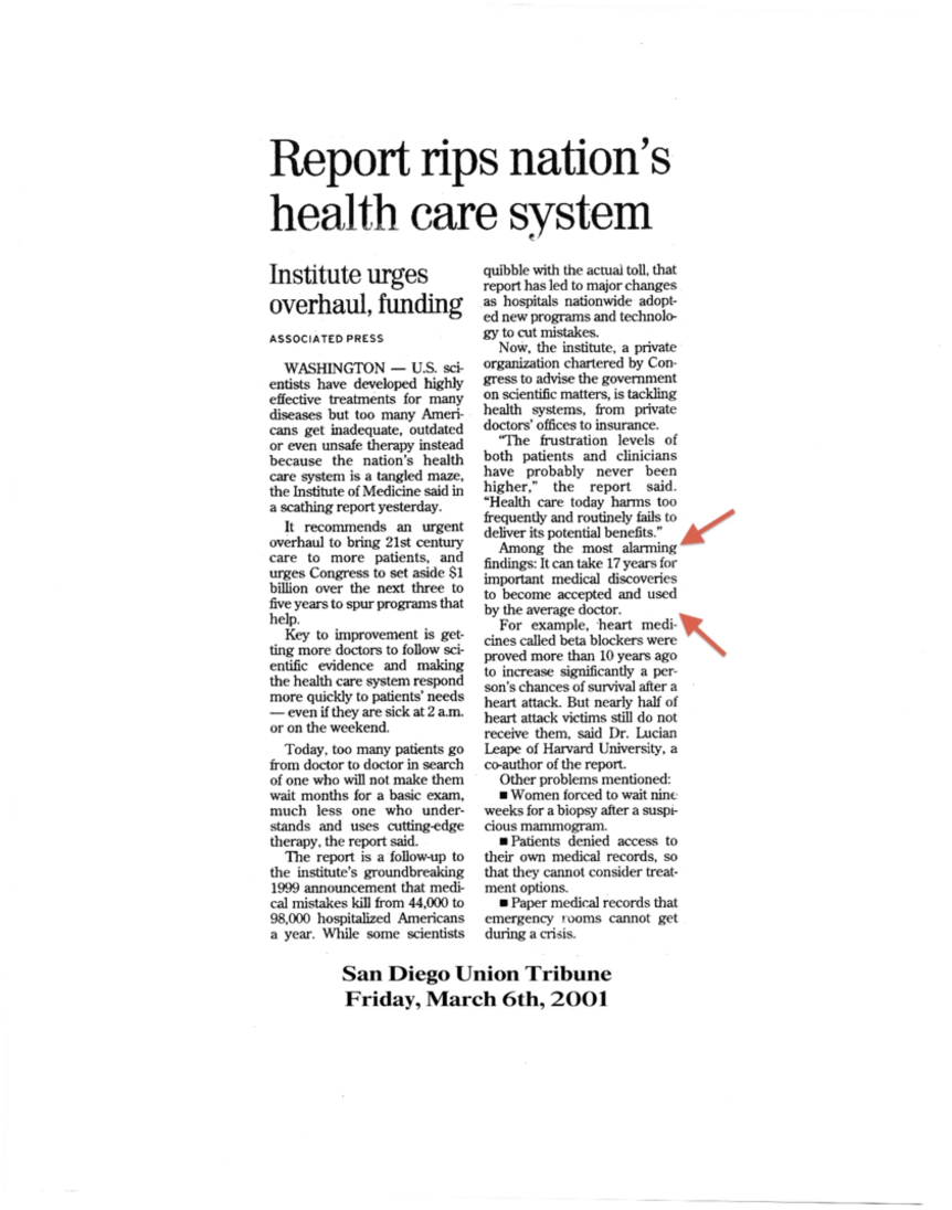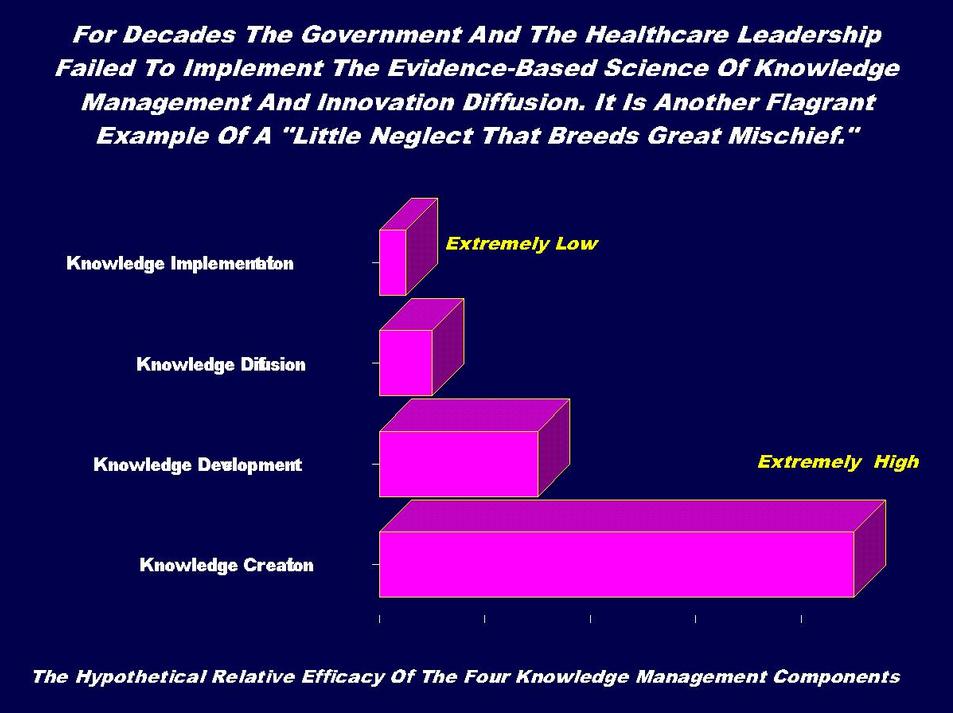 American healthcare is a knowledge intensive industry. However, knowledge management is a massive failure. The deeply embedded model of knowledge management, called the Flexner model, is more than a century old. Although it is totally obsolete, it has not been replaced. The failure of timely knowledge management explains why it takes up to 17 years for an innovation to reach the front lines of American medicine as demonstrated in the report cited here.