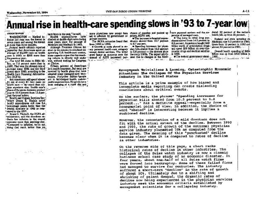 This article appeared in November, 1994. It said the slowdown was: "an abatement in spending on physician bills." It was a prime example of pernicious propaganda. The word "abatement" means a cushioned decline. Here is the data from the gold-standard Federal study tracking the evolution of the healthcare industry for 60 years. The three major components of the healthcare provider industry suffered an unprecedented implosion in a critical factor: the industry rate of growth.