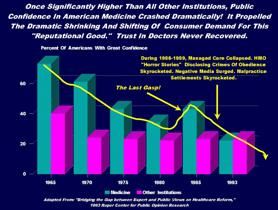 Why Did Public Confidence (Trust, Assurance) In US Medicine Implode About 70% Since 1965? Medicine Is A “Reputational Good.” When Trust Falls, Consumer Demand Falls, And Revenues Decline. Proactively Managing This "Intangible Asset" That Is One Dimension Of The Organizational Climate Would Have Avoided And Reversed This Far-Reaching Debacle.