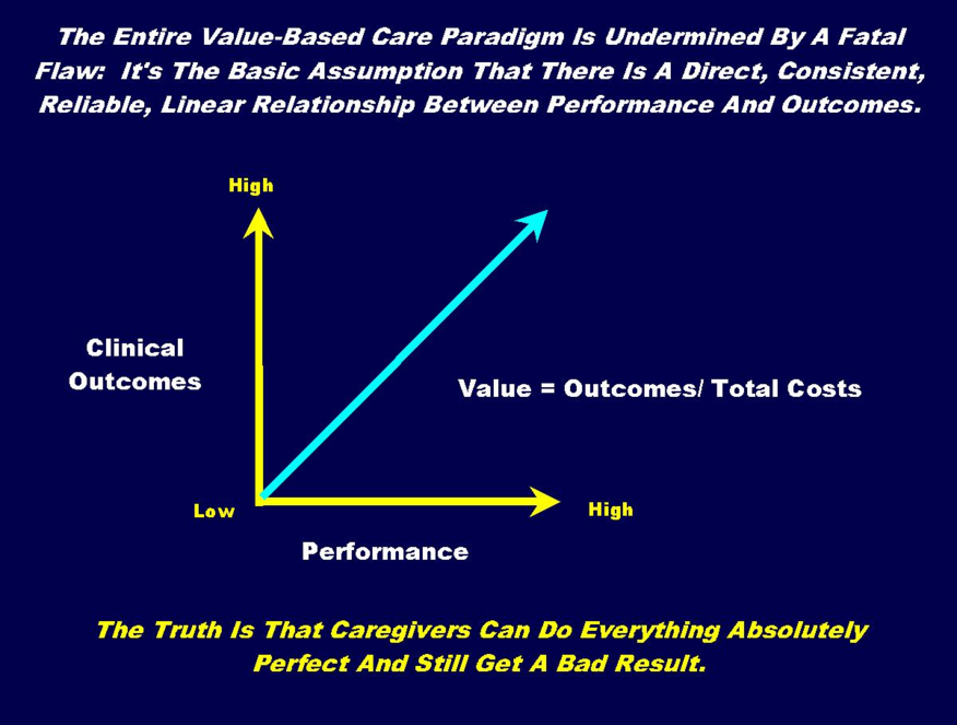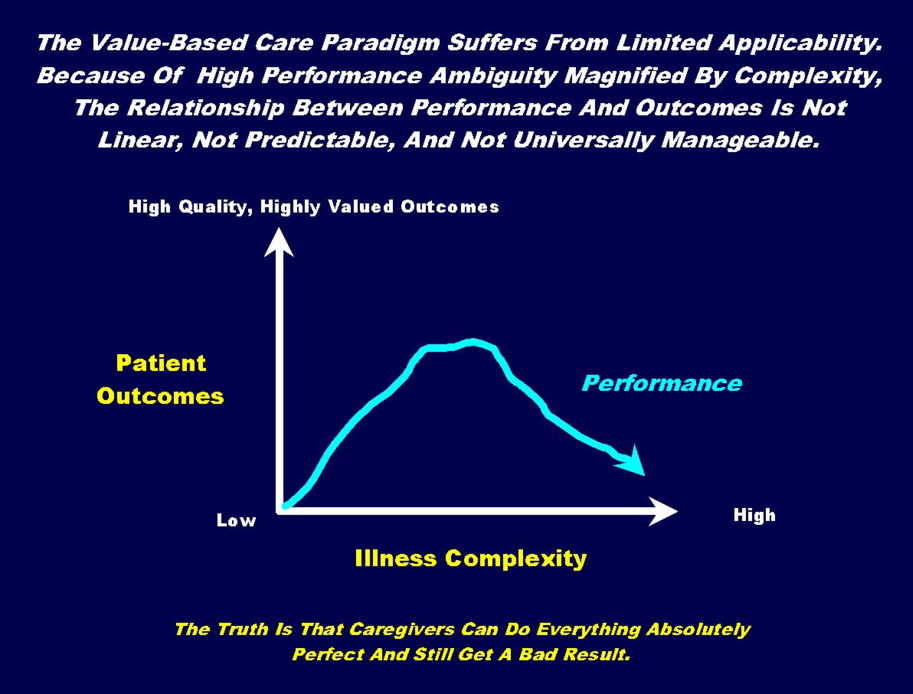 One of the main dimensions of a professional service is performance ambiguity that is compounded by complexity. The fatal flaw of the value-base models of healthcare is the wrong assumption that there is a direct, linear relationship between performance and quality.