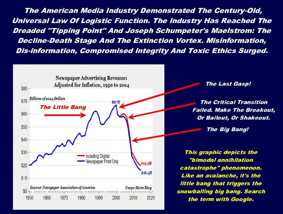 What is truly astonishing is that there is a large majority of folks who refuse to believe the shocking evidence that the American healthcare "system" is now facing the dreaded "tipping point" and a sudden and violent, domino-effect, self-breeding collapse into the universal creative destruction maelstrom: the decline-death spiral and the extinction vortex. This addendum will present more evidence.