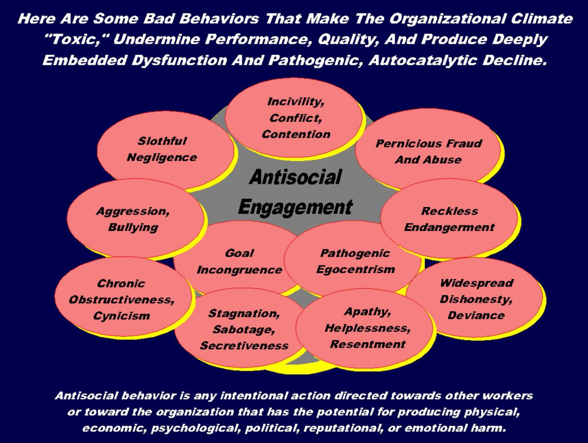 An industry is a diverse collection of organizations. When an industry gets "sucked" into the creative destruction maelstrom, in organizations that are not managed with the appropriate level of management sophistication, the working climate shifts from prosocial to antisocial. Workers' behaviors collectively become increasingly "toxic" and increasingly counter-productive. Good citizenship behaviors must be objectively identified, measured, and nurtured to insure enduring prosocial engagement.