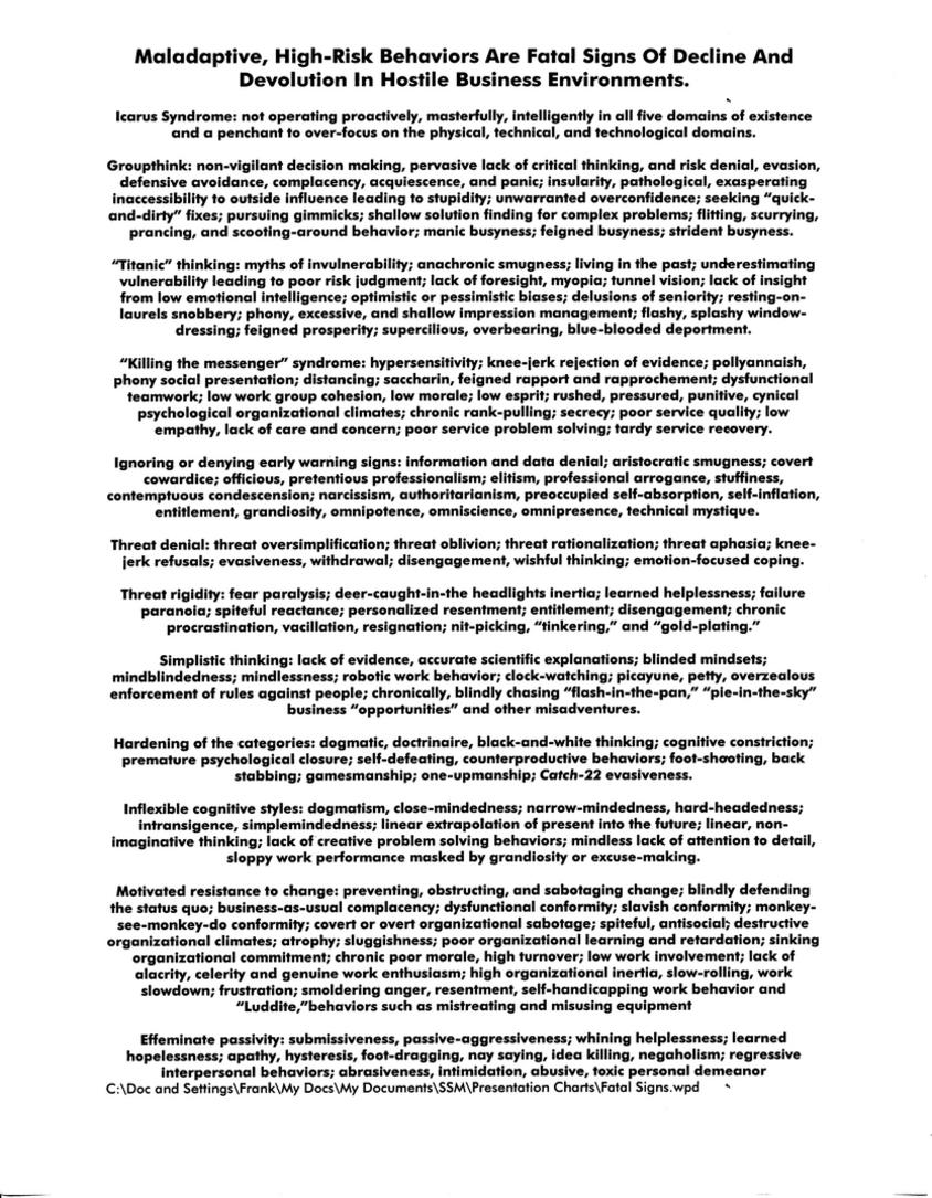 There is a well-developed, yet virtually unknown, management knowledge base about this fatal trap. Those folks who refuse to believe the scientific evidence and hide behind the high walls of denial, defensive avoidance, fear paralysis, procrastination, disengagement, Pollyanna (blindly optimistic), the Dunning-Kruger effect (inflated self-image, self-ignorance generates bliss), Anosognosia (an inability to perceive threats and a lack of concern about current difficulties, or impaired self-awareness), the Three Monkey syndrome (hear no evil, speak no evil, see no evil, mindless compliance), the Ostrich syndrome (having one’s head in the sand), the Geek Syndrome (Nerds, tech-nerds, people who lack basic social and motor skills, seem unable to decode body language and sense the feelings of others, dehumanization), the Icarus Syndrome (becoming so obsessed with novelty or technology that one ignores repeated warnings and suffers grave consequences), and Groupthink (non-deliberate suppression of critical thinking, common wisdom, or the obvious facts in order to conform to group norms and achieve group harmony).