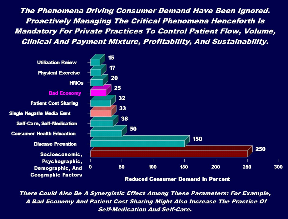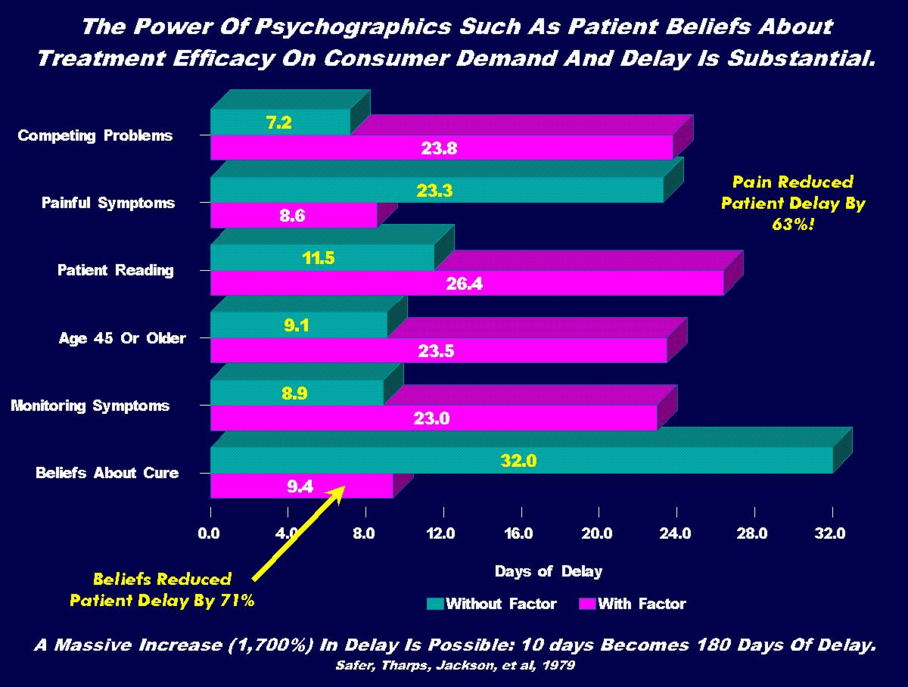 One of the phenomena that can dramatically reduce consumer demand for professional services is patient delay. These are the factors that can influence patient delay. Pain can reduce patient delay significantly, yet a person's beliefs in the efficacy of the "system" can have a profound effect on delay. These factors can cause a massive increase in patient delay; 10 days can become about six months of delay. Not proactively managing patient delay is cause by the huge management knowledge gap.