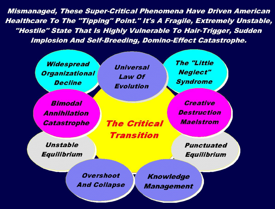 One reason the 30+ year R&D program is the definitive authority on the evolution of the four major components of the provider sector of the healthcare industry is because the program produced the first and only scientific explanation of the fundamental evolutionary forces and the powerful, super-critical phenomena that have been both ignored and mismanaged by the leadership and the government for five decades and that have at this moment driven the industries to the "tipping point" and the bimodal annihilation catastrophe. It's the little bang that triggers the big bang.