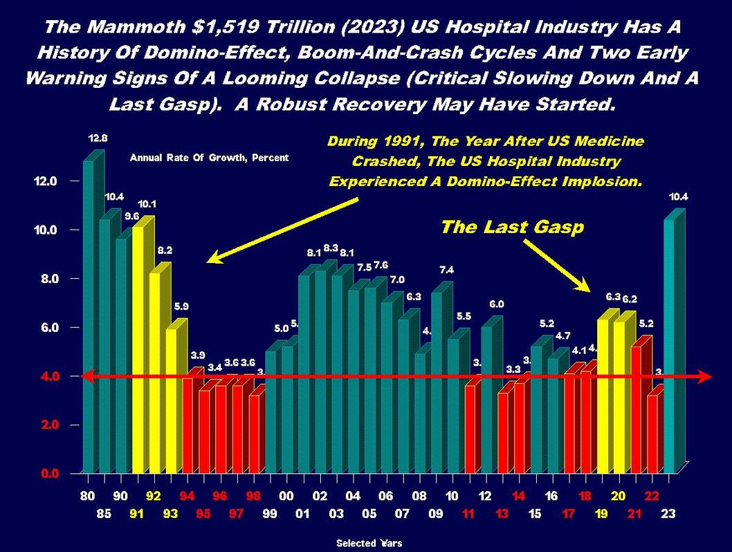The US hospital industry is huge. It has a history of Domino-effect, boom-and-crash cycles which have caused high instability. In 2023 it demonstrated what migh be a robust recovery which was a knee-jerk response to years of slowdown. The big question is: will the recovery be sustained? Because of the huge management knowledge gap it's unlikely. This most critical industry is at the most critical point in its history. It it fails to make the mandatory critical transition, or the breakout, it will get "sucked" into the decline-death stage "maelstrom" and collapse.