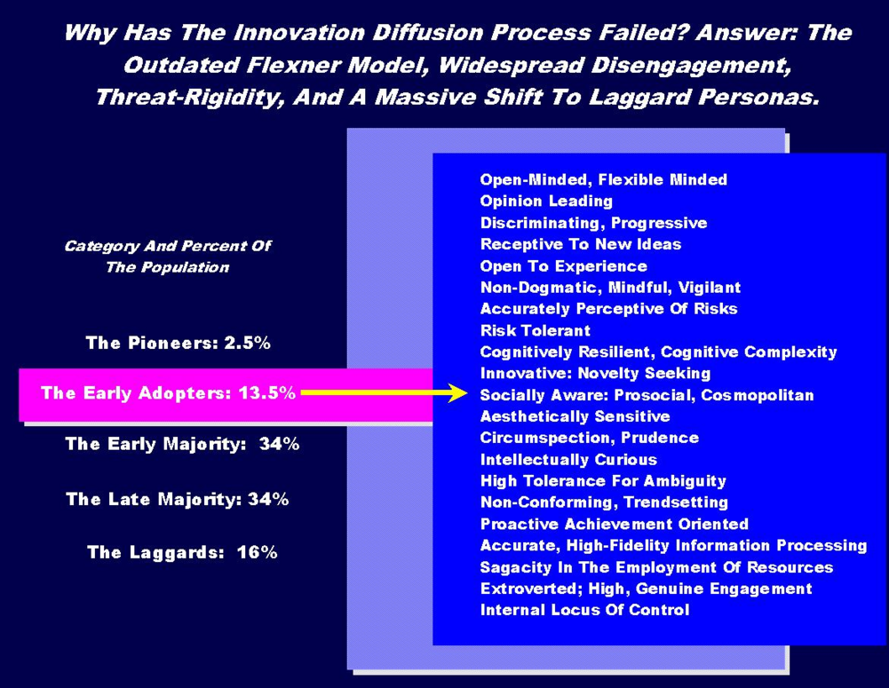One of the projects in the 30+ year R&D program found a significant lack of early adopters and is a leading cause of the failure of innovation diffusion, implementation, and knowledge management. In the field of innovation, there is an old saying: You can always tell the Pioneers; "they are the ones with the arrows sticking out of their butts." The Laggards demonstrate the Archie Bunker syndrome: close minded, narrow minded, simple minded, and the lovable bigot.