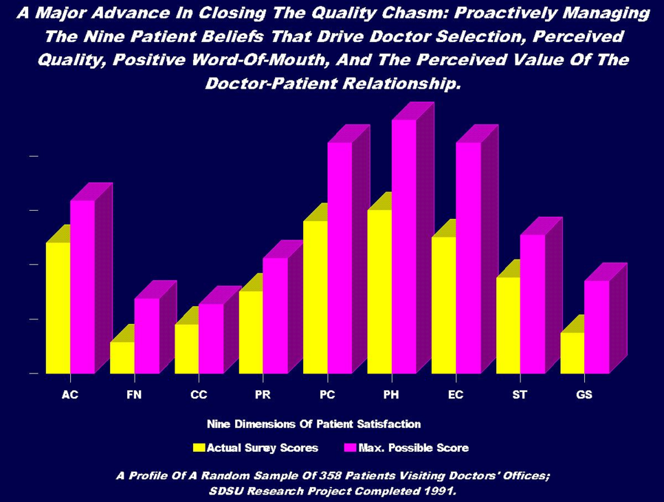 From more that 160 published studies researching patient satisfaction, the 30+ Year R&D Program collected the nine dimensions that characterized this phenomenon. The hypothesis was that if patient satisfaction could be measured and managed to maximize patient satisfaction, it would boost the perceived quality of care. This work demonstrated that neither patient satisfaction nor clinical outcomes could be measured accurately and consistently. This flaw is why the Donabedian model must be replaced.
