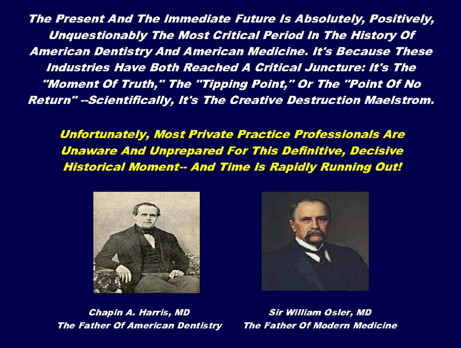 What Is Truly Astounding Is That The Scientifically Legitimate, Historically Valid, Eminently Authoritative Solution To The Collapse Of American Healthcare Industry Was Discovered More Than Three Decades Ago! Unfortunately, This Seminal Work Was Ignored By The Doctors, The Dentists, Their Handlers, And The Bureaucrats. By Today, Organizational Decline Is Widespread. Most Provider Organizations From Private Practices To Huge "Systems" Lack The Requisite Level Of Management Sophistication To Implement Successfully The Principles Of Survival In A Hostile Environment.